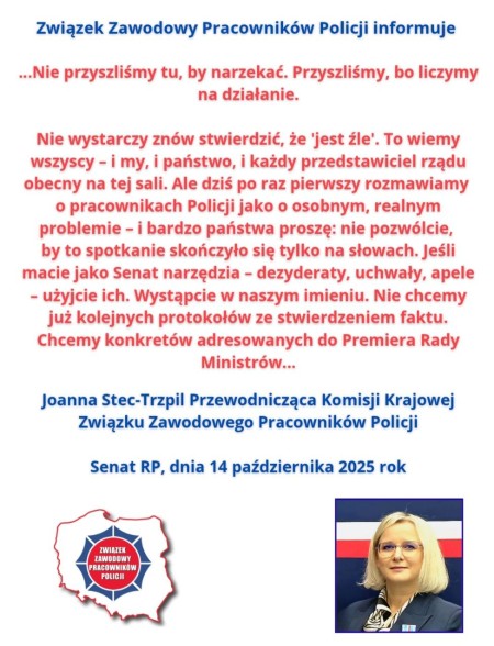 🗣️ Podczas obrad w Senacie RP Przewodnicząca Joanna Stec-Trzpil zgłosiła wniosek do Pana Ministra Wiesława Szczepańskiego o ponowne wystąpienie przez MSWiA do Szefowej Służby Cywilnej w sprawie bezkonkursowego przeniesienia pracowników Policji nieobjętych mnożnikowym systemem wynagradzania do służby cywilnej.