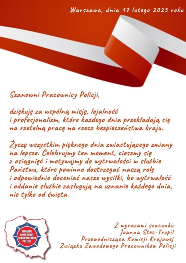 17 lutego 2025 r. odbyły się obchody Święta Służby Cywilnej w Kancelarii Prezesa Rady Ministrów. Na zaproszenie Szefowej Służby Cywilnej w wydarzeniu udział wzięła Przewodnicząca Związku Zawodowego Pracowników Policji Joanna Stec-Trzpil. Obecność na uroczystościach przyniosła naszej przedstawicielce wiele refleksji, z których dwoma chcieliśmy się podzielić.