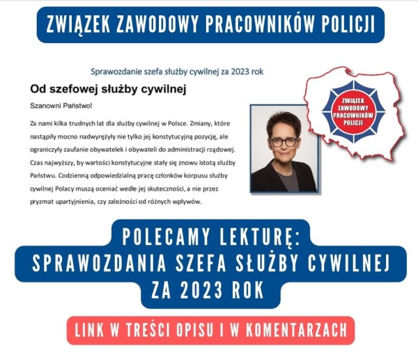 ❗❗❗Zapraszamy do lektury "Sprawozdania Szefa Służby Cywilnej o stanie służby cywilnej i o realizacji zadań tej służby w 2023 r.", w którym znajdziecie fragment zacytowanej przez nas wypowiedzi oraz szereg bardzo istotnych informacji, istotnych również przez pryzmat naszej grupy zawodowej - pracowników Policji. 📖👨💼👩💼