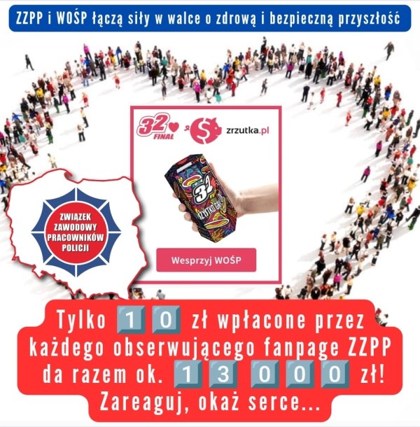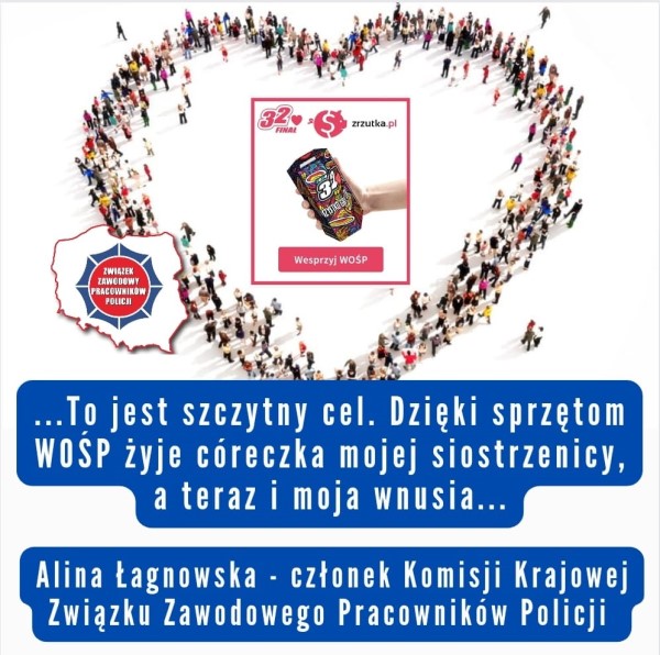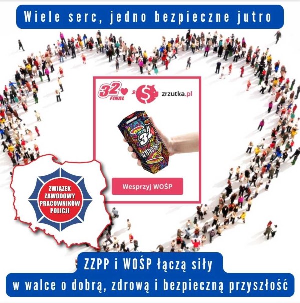 📣📣📣Wiele serc, jedno bezpieczne jutro – Związek Zawodowy Pracowników Policji razem z Wielką Orkiestrą Świątecznej Pomocy serdecznie zapraszają do wzięcia udziału w 32. akcji WOŚP. Razem możemy walczyć o dobrą, zdrową i bezpieczną przyszłość dla wszystkich.❤️