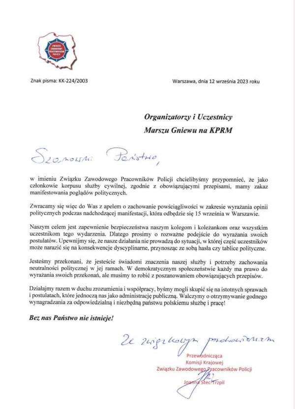 W imieniu Związku Zawodowego Pracowników Policji pragniemy serdecznie podziękować Stowarzyszeniu Absolwentów Krajowej Szkoły Administracji Publicznej (KSAP) za wsparcie i solidarność w naszym wspólnym dążeniu do zapewnienia godnych warunków materialnych pracownikom służby publicznej. To poparcie dla postulatu Komitetu Protestacyjnego Pracowników Sfery Publicznej oraz organizowany marsz protestacyjny 15 września są wyrazem jedności i determinacji w dążeniu do sprawiedliwości.
