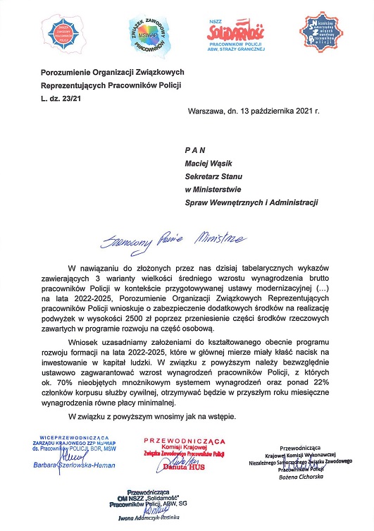 Uprzedzając jutrzejsze rozmowy w Ministerstwie Spraw Wewnętrznych i Administracji przedstawicielki Porozumienia Organizacji Związkowych Reprezentujących Pracowników Policji skierowały wniosek do Wiceministra Maciej Wąsik, dotyczący zabezpieczenia dodatkowych środków finansowych na podwyżki dla pracowników Policji.