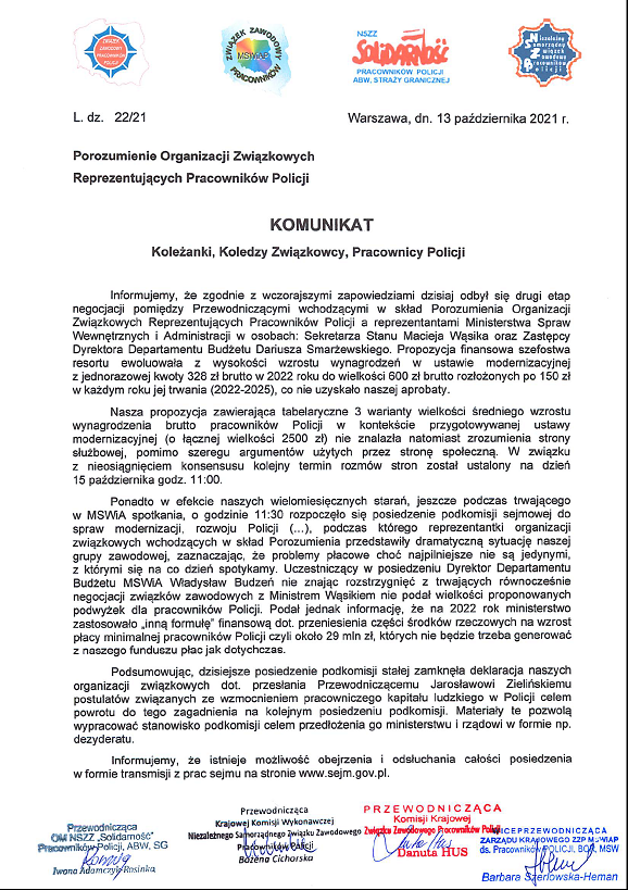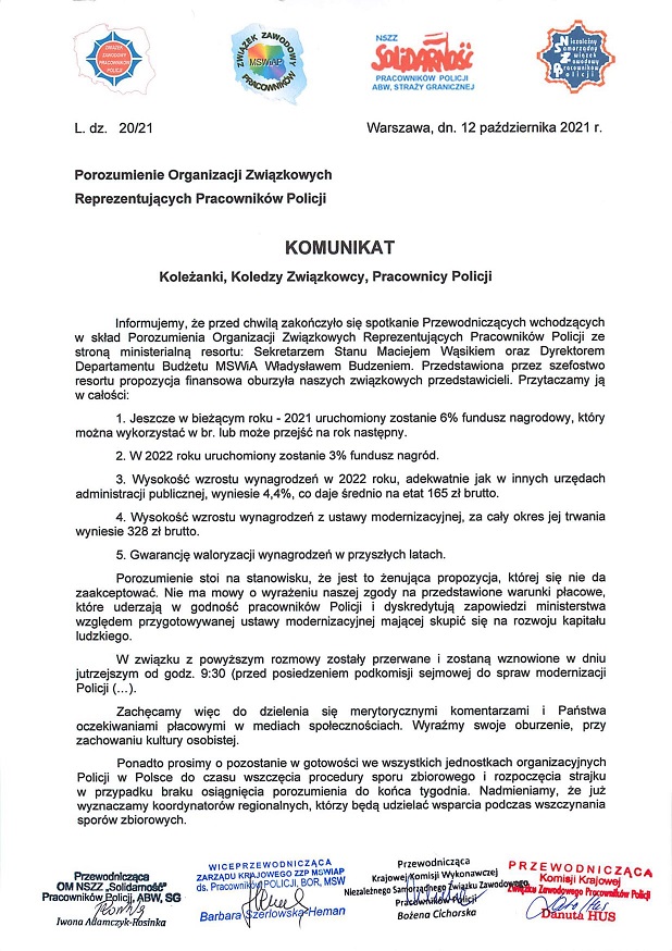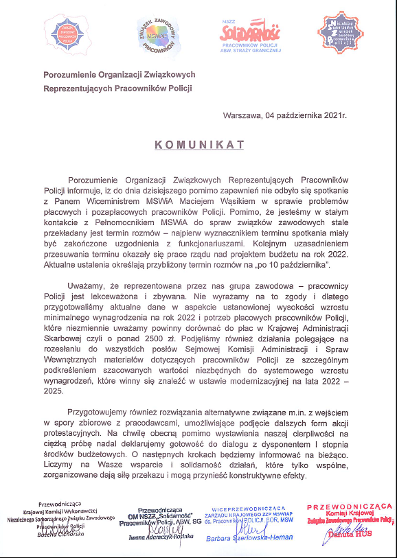 NAJNOWSZY KOMUNIKAT POROZUMIENIA – BRAK ZGODY NA PROPOZYCJE MSWiA, KOLEJNE NEGOCJACJE ZA DWA DNI: 15 PAŹDZIERNIKA W PIĄTEK. |
