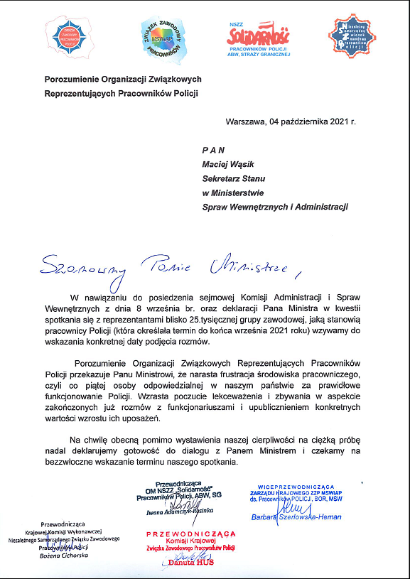 WNIOSEK POROZUMIENIA ORGANIZACJI ZWIĄZKOWYCH REPREZENTUJĄCYCH PRACOWNIKÓW POLICJI O SPOTKANIE Z WICEMINISTREM WĄSIKIEM |