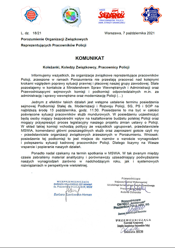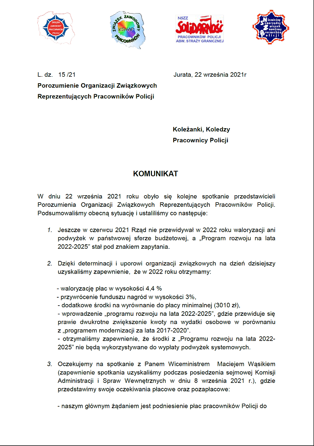KOMUNIKAT PRASOWY POROZUMIENIA ORGANIZACJI ZWIĄZKOWYCH REPREZENTUJĄCYCH PRACOWNIKÓW POLICJI. |